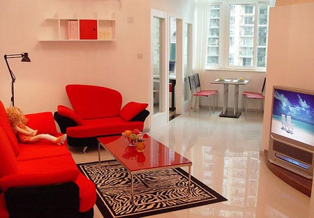 跳跃的红色沙发、个性的条纹地毯简易地实现了餐厅、客厅的区域划分,整个空间连成一体同时又各有分工,并且可以让空间变得更有层次感,克服了狭小空间带来的沉闷感。