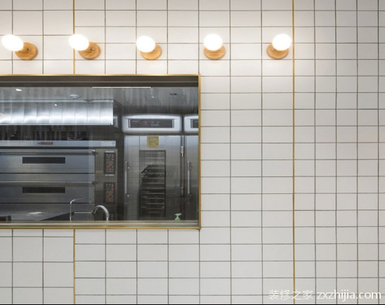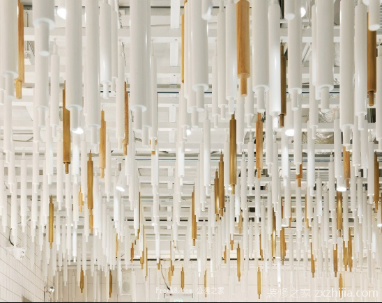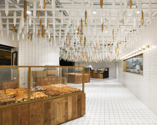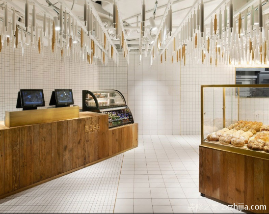 本案面包店门口logo墙面采用大小相同的老板拼接而成木板本身不同的自然纹理和深浅颜色表现出原始生态的自然美。设计师在室内用白色瓷砖装饰墙壁。六种规格的白色瓷砖将墙壁和地板分为七个区域。地面和墙壁相互对应,并使用相同规格的白色地砖。不同规格之间的瓷砖接缝用黄铜条封闭,干净简单。白色天花板上挂着无数不同长度的擀面杖。白色擀面杖主要用于装饰木色和金属黄铜色的擀面杖,这也呼应了面包店的整体色调。擀面杖原料的使用也凸显了面包店手工烘焙的文化。面包店的家具都是用原木色的老木板做成的。木材的自然纹理和柔和色调非常和谐地融入白色空间,展现出自然、纯净、清新、纯净的美。