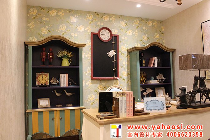 主要材质:硅藻泥、印花及条纹壁纸、墙板;