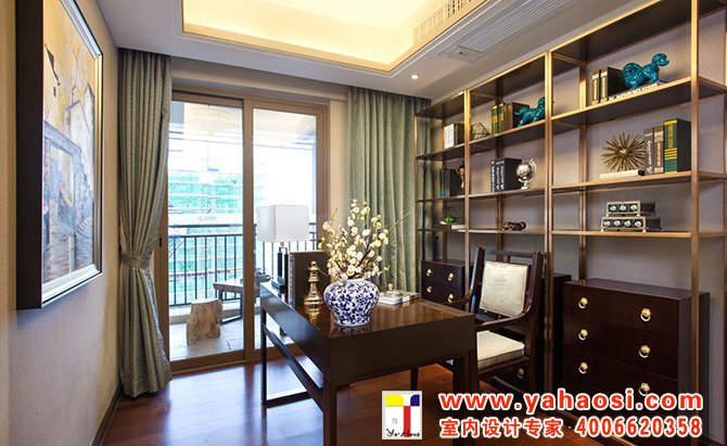 增加了文人气质的中式力量,以及搭配质感奢华的摆件、实木储物柜与金属书架的高度融合,达到