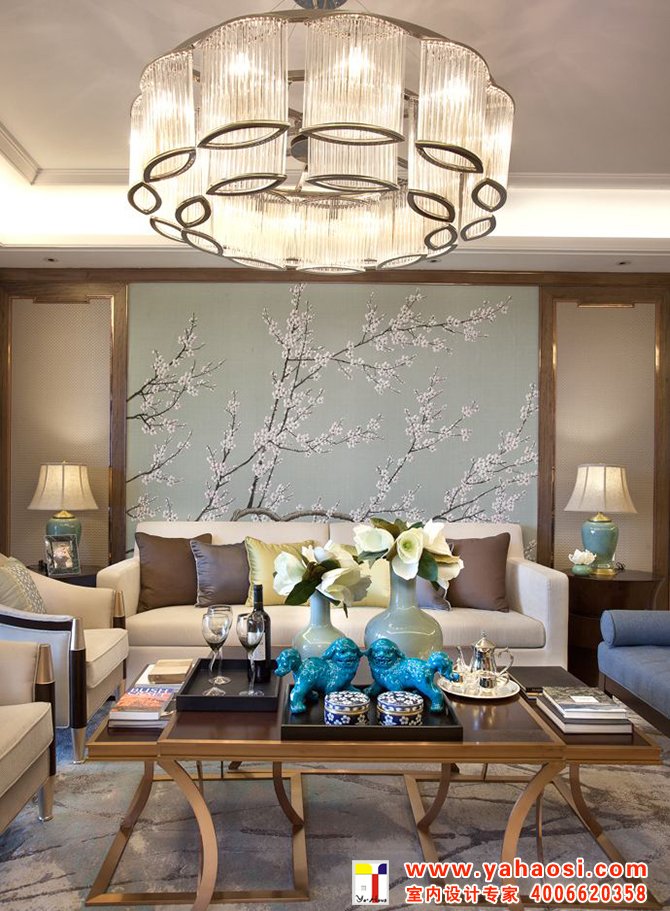 通过柔和、协调的大地色衬托着永不过时的时尚。无靠背沙发,陶瓷摆件、淡雅梅花墙的蓝色深浅