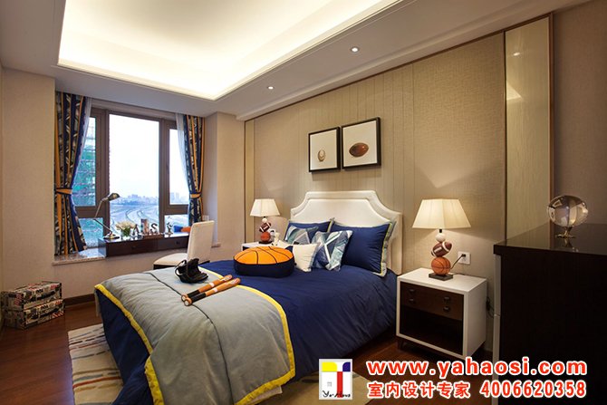入了更多的活泼元素,各种球类堆砌的床头灯,精巧的篮球抱枕,曲棍球、橄榄球的个性挂画、以