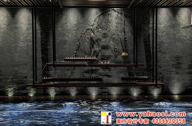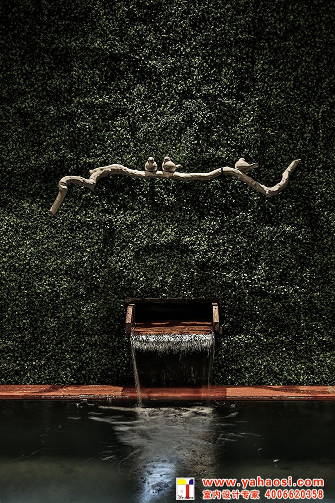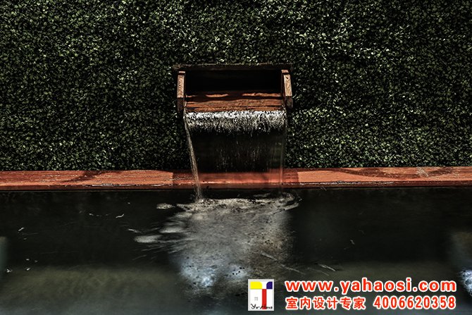 透过格栅射下的光影,斑驳淋漓,仿佛让人在绿荫光影中自在穿行,绿植墙面与水的呼应又使