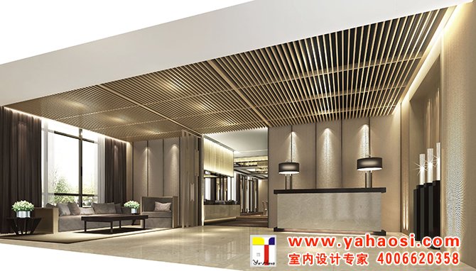 由主空间栅条形态元素中的白橡,镜面古铜,法国米黄石,灰茶镜之材料的几何组合出