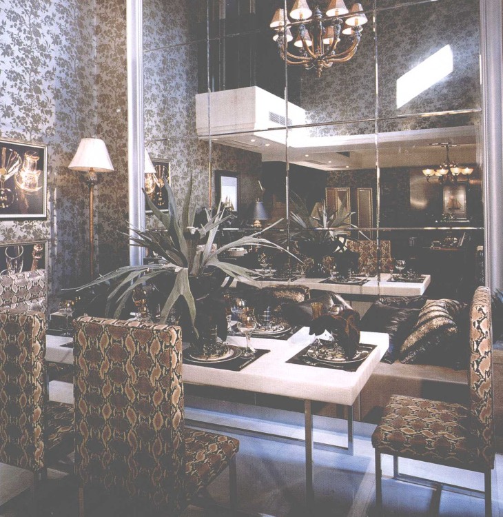 在墙面上使用一面超大的镜子,可以放大餐厅空间并且提高整个空间的奢华感。与椅子同色彩的壁纸可以更好地展示餐厅的协调感。完全独立的超大餐厅,酒柜,餐桌和配餐柜及橱柜一应俱全。长形餐桌是这个餐厅的主角,放置在一块羊毛印花地毯上,突出了重点。由于面积足够大,靠墙的位置还摆放着酒柜,里面有主人珍藏的酒。远端靠墙处还有一个餐边柜摆放着一些精美的瓷器和器皿。别墅中的高屋顶安装具有欧洲风情的大吊灯,可以平添几分异域风情。