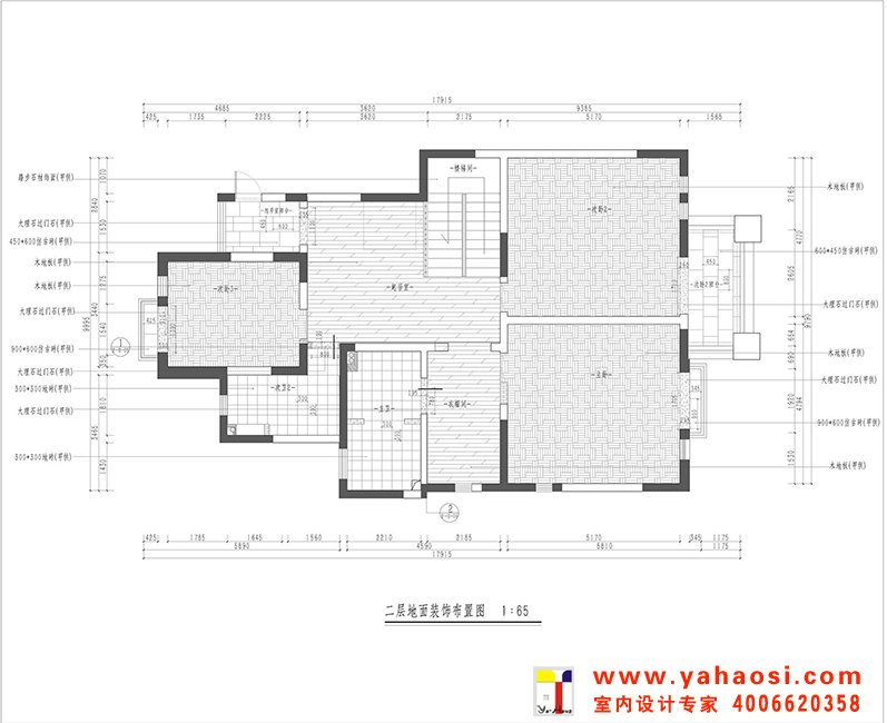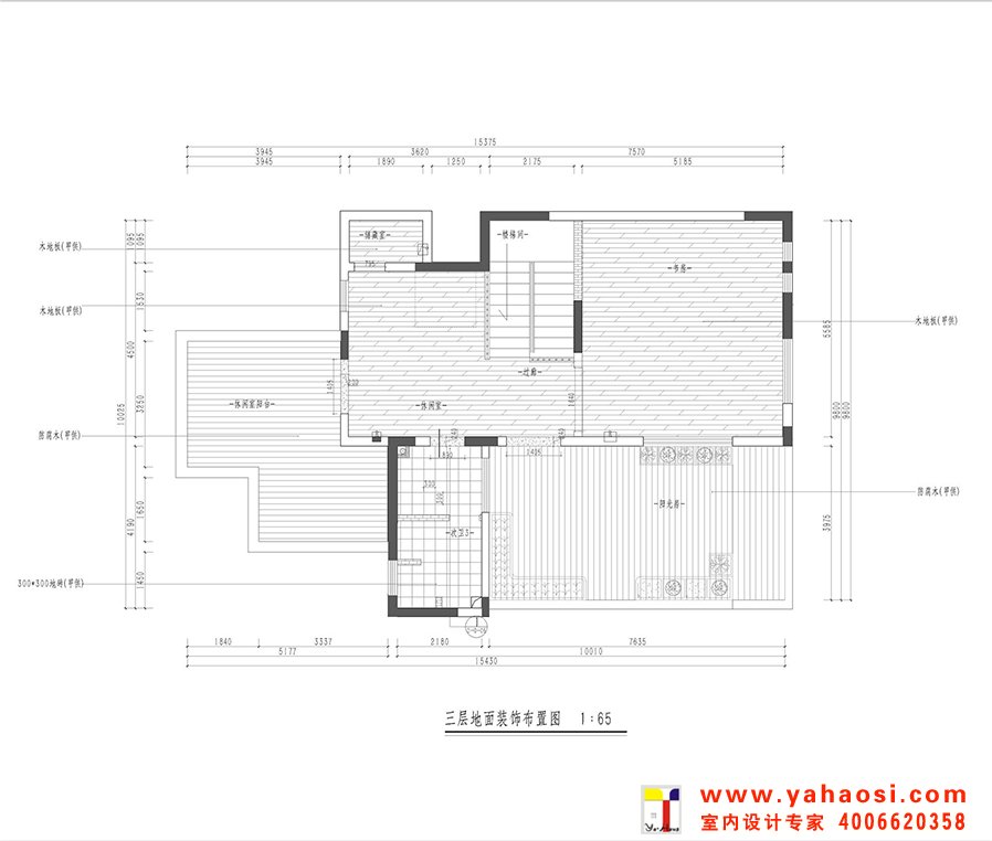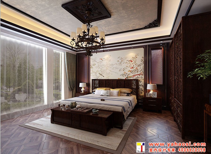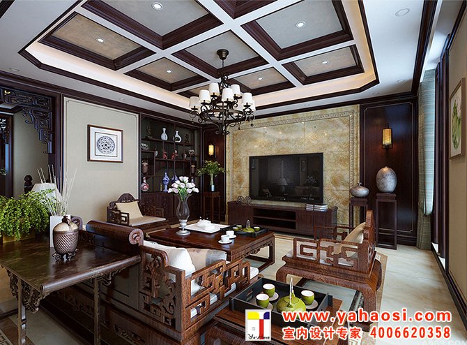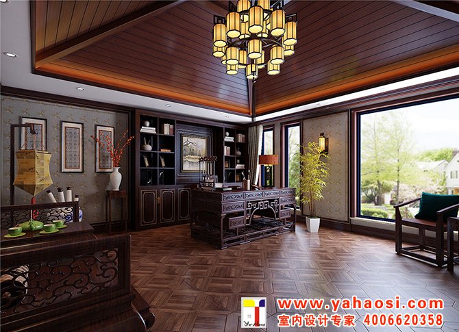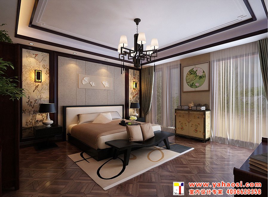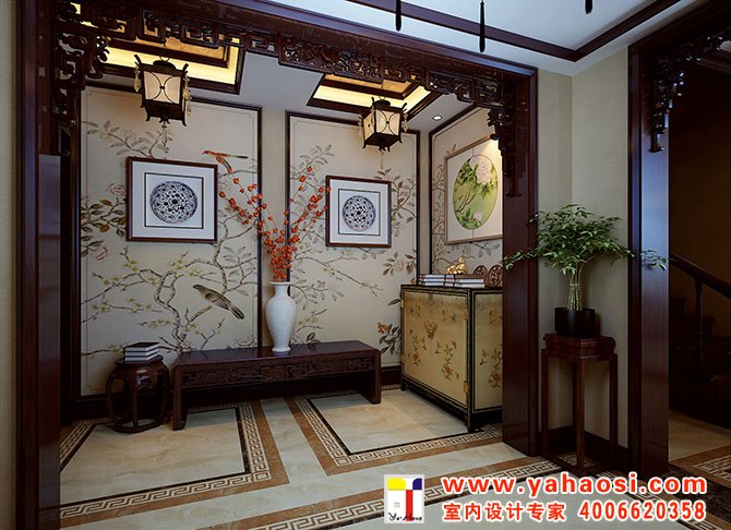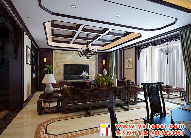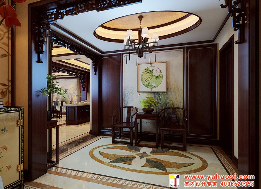 中式文理做为地面区域划分点缀,在墙面上用了深色护墙板及公共空间大面处理上用简洁明