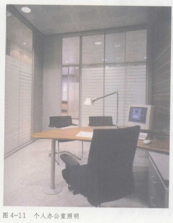 个人办公室是一个个人占有的小空间,较之一般办公室,顶棚灯具亮度不那么重要,能够达到一般照明的要求即可,更多的则是希望它能够为烘托一定的艺术效果或气氛提供帮助。房间其余部分由辅助照明来解决,这样就有充分的余地运用装饰照明来处理空间细节。个人办公室的工作照明围绕办公桌的具体位置而定,有明确的针对性.对于照明质t和灯具造型都有较高的要求(图4-11)。