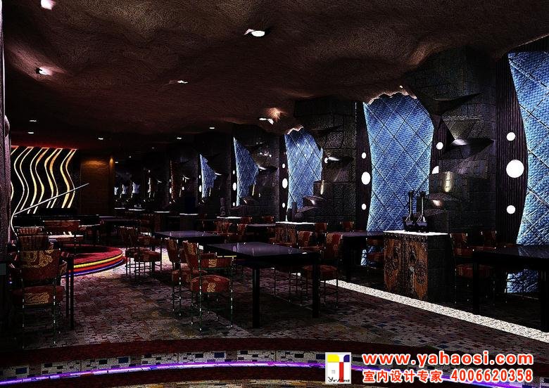 大多数设计者都会采用绿化来消融墙角的生硬感,显得生机盎然。室内绿化是主要利用植物并结合园林中常见手法,组织完善美化它在室内所占有的空间。协调人与环境的关系。攀援植物是墙面上很好的装饰品,这在阳光充沛的室内空间里是有可能实现的。个性的风格是酒吧设计的灵魂,就像人类的思想。酒吧文化从某中意义上来讲是整个城市中产阶级的文化聚集场所,它最先感知时尚的流向,它本身自由的特性又吻合了人们渴望舒缓的精神需求。酒吧的设计风格应个性鲜明,如图下它以海底世界为主题,它在色彩、形状、质感上临摹着海给人的气息,主题鲜明的酒吧设计有力的宣扬了个性化的风格,达到了强化顾客印象争取好感的目的。