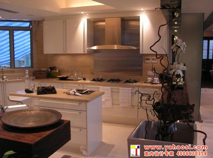 最好铺贴哑光瓷砖,哑光瓷砖会使人感觉不好清洗,其实这是错误的,品质好的哑光瓷砖不但非常容易清洗,而且其细腻、朴实的光泽更能显示出主人高雅的审美观,令别墅厨房的品位更加和谐、自然。