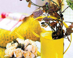 曲调:柔软的嫩黄色法国小菊,将其插在锥形砖红色容器中,缩口的外形使小菊呈现向外散开的特征,而且空气不易进入、水也不容易发臭;柔和的黄色能将客厅烘托得十分高雅。
