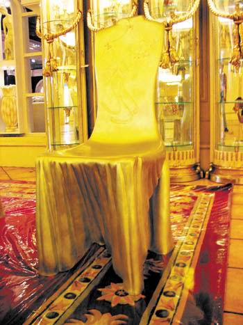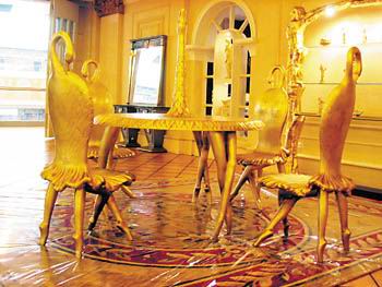 在罗浮宫欧美家居广场,展示着全新的欧洲进口产品《天鹅湖》餐台椅,全套由六张餐椅和一张餐桌组成。以著名芭蕾舞剧《天鹅湖》为基调,整套餐台椅给就餐者营造出强烈的浪漫艺术气息。六张天鹅造型的餐椅排放在天鹅公主造型的餐桌四周,餐桌椅的腿是一双双富有强烈表现力舞者穿着芭蕾舞鞋的纤纤秀腿,餐椅的靠背则是自然的天鹅情状,一只只天鹅还优雅地勾下脖子,用嘴梳理着美丽的羽毛。