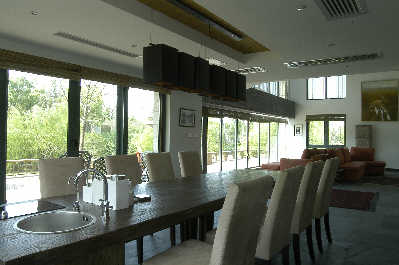 一楼大厅里的餐厅可以说是设计师的神来之笔。就餐的桌子用长4.7米的天然老榆木做成,桌上的细纹触手可摸,可以供10个人同时就餐。桌子一头嵌入电磁灶和圆水盆,使功能与美感皆备。餐桌顶上用细竹吊顶,半空中6盏黑面红里的 吊灯 ,仿佛是江南庭院中悬挂的灯笼,散发着柔和、喜庆的光。