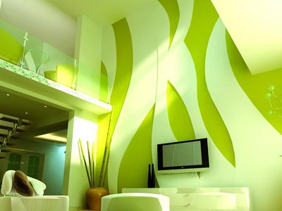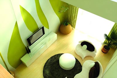 客厅:原建筑的缺陷使得整个电视背景墙面从视觉上给人造成一种失重的感觉,所以设计师运用曲线的造型很巧妙地把这个缺点隐藏了起来,仿生的曲线造型极富生命力。为了让整个房间动起来,设计师选用了嫩绿色作为主打色彩,并用流畅的线条传递了绿色的生命力,使整个装修充满了活力。这也符合业主期望的时尚主题。