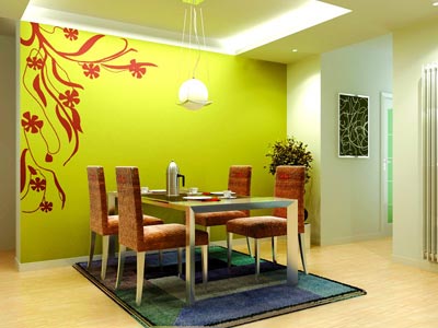 餐厅:通过一样的色彩,使相对独立的餐厅与客厅联系在了一起。嫩黄色背景墙上伸出了花朵的枝蔓,也许在这里可以听到花开的声音,一个浪漫而富有情调的就餐环境就此产生了。