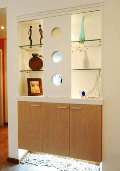 木板要省钱也可以从壁板动脑筋。柜子钉壁板除了有防潮的功能外,还有受重的考量。若壁面没有渗水的问题,没有放置重物,可以不要钉柜子的壁板。像主卧这面展示柜,主要是要让屋主放置个人收藏品及化妆品,所以设计师并没有钉上壁板,这样既省钱又有美感。