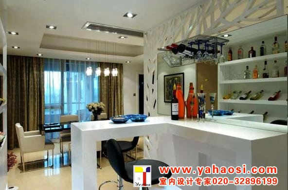 这两种设计手法分别体现出一种浪漫优雅和现代时尚的风格。夏季则换上15W蓝色灯泡,以获得清凉宁静的效果。酒吧柜一般旋转在客厅或较宽的过道中,柜形可根据具体地形来设计或购买,“一”字形或“L”形都可以。