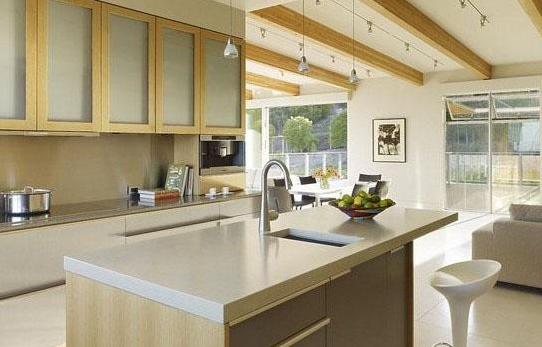 10、展示设计看厨房可以显示主人的品位,这种品位主要体现在一些有创意的设计上,别墅厨房吊柜可以设计一些玻璃门或吊格,柜内安装圆杯灯,便于存放收藏品或书籍。
