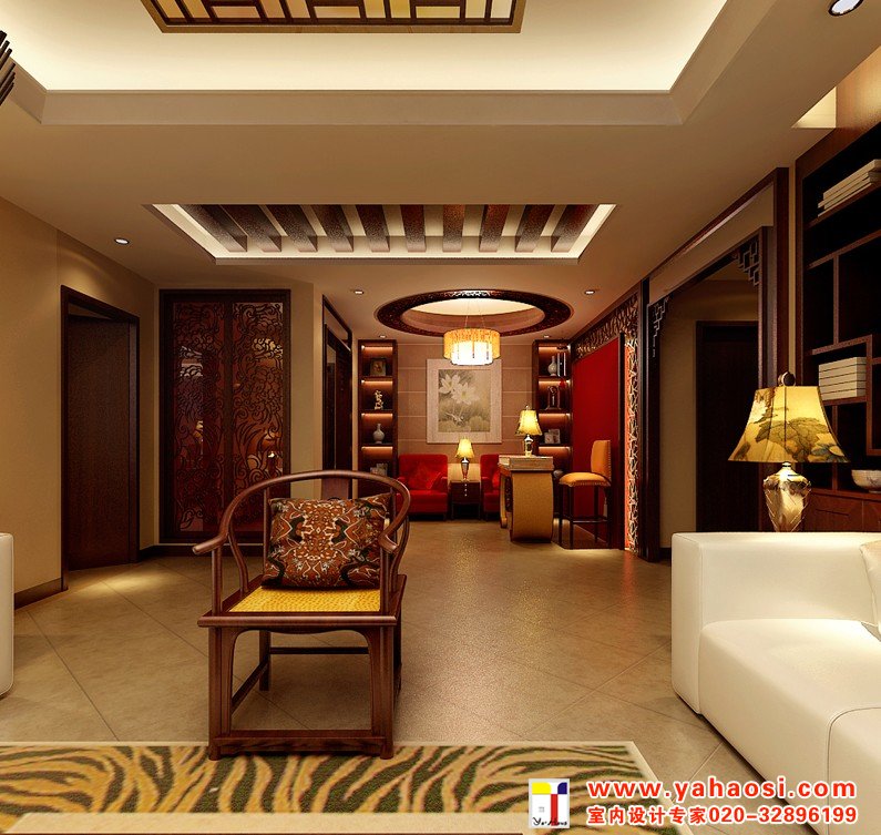 四周吊顶,中间不吊,此种吊顶可用木材夹板成型,设计成各种形状,再配以射灯和筒灯,在不吊顶的中间部分配上较新颖的吸顶灯,会使人觉得房间空间增高了,尤其是面积较大的客厅,效果会更好。四周吊顶做厚,中间部分做薄,形成两个层次、此种方法四周吊顶造型较讲究,中间用木龙骨做骨架,而面板采用不透明的磨砂玻璃;玻璃上可用不同颜料喷涂上中国古画图案或几何图案,这样既有现代气息又给人以古色古香的感觉。
