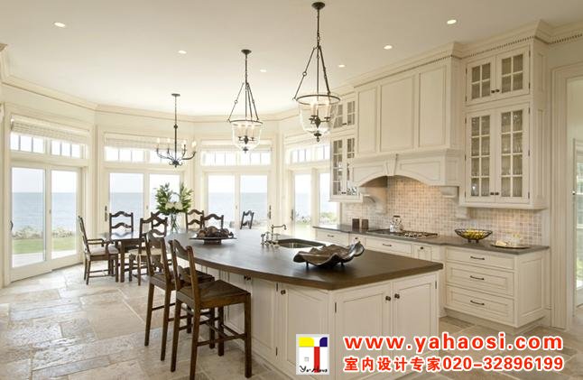 1、 别墅设计里的空间设计应该呈现利用率高的特点与普通户型相比别墅厨房的面积大、层高(径向)较高,通常都在3米以上。房主经常在这里举行PARTY等聚会活动。作为一个社交场所,在设计厨房时充分地利用高度方向上的空间,在满足了基本的储物空间、操作空间的前提下,要留有足够的活动空间。对厨房空间进行分割,一般采用岛式或者半岛式布置,在岛的上方可以设计铝制吊架、实木系列吊架、玻璃吧台等。既可以充分利用空间,又让使用极为便利。在空间允许的情况下,可以在厨房的一侧设计一排筒柜,把冰箱、烤箱、消毒柜、卷帘门全部集中在此,显得很有气势。