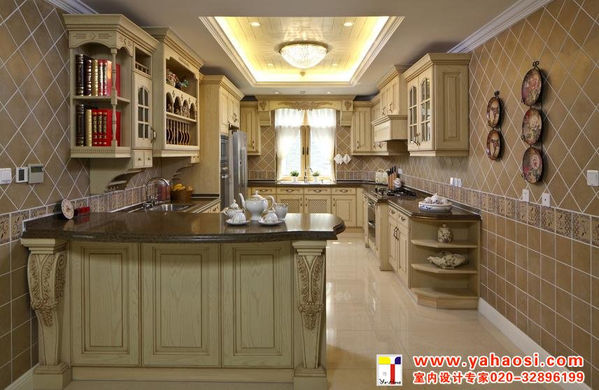 与普通户型相比别墅厨房的面积大、层高(径向)较高,通常都在3米以上。房主经常在这里举行PARTY等聚会活动。作为一个社交场所,在设计厨房时充分地利用高度方向上的空间,在满足了基本的储物空间、操作空间的前提下,要留有足够的活动空间。此外,要对厨房空间进行分割,一般采用岛式或者半岛式布置,在岛的上方可以设计铝制吊架、实木系列吊架、玻璃吧台等。既可以充分利用空间,又让使用极为便利。在空间允许的情况下,可以在厨房的一侧设计一排筒柜,把冰箱、烤箱、消毒柜、卷帘门全部集中在此,显得很有气势。