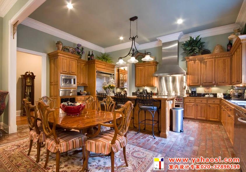 餐厅、厨房美式风格不同于我们了解的中式风格,因为其饮食习惯,美式风格的厨房是开放式的,所以通常与餐厅联络在一起。如果您偏爱中餐,那么主张你关于开放式厨房做一些格外处置,如采购超大吸力的油烟机,或许其它办法,究竟从发生油烟的视点来说,每日在开放式厨房中烹饪中餐,会是一件很可怕的工作。圆形实木餐桌,碎花图画软包的实木座椅,是美式个性餐厅的标配,灶台、橱柜挑选白色或许原木色皆可。