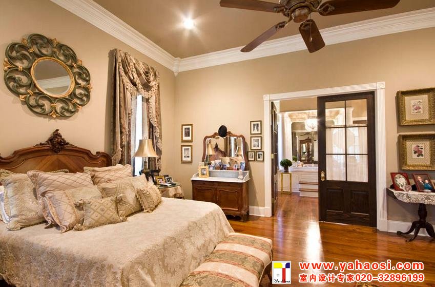卧室作为田园类风格的代表,美式乡村风格的卧室当然要以舒服为先。不用设置过多的灯饰,光线也要以暗黄色为主。碎花图画的布艺装修、地毯、靠垫十分有利于打造温馨的气氛。