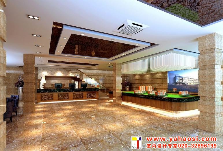7、售楼中心装修的整体设计要通透、明亮、温馨,有气氛,其整体形象需与本项目的形象相符,造型简洁、大气,室内气氛活跃、明快。因此,建议售楼处的整体布局多采用暖色调因素,利用灯光设计、墙面布景及办公用具来营造气氛。