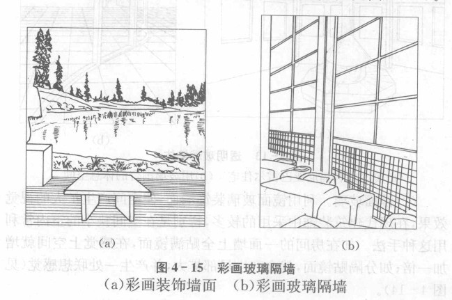 彩画玻璃。虚幻空间就是利用彩画玻璃,用不同的装饰手法,将人们的视觉带到虚幻空间中去。一般人们往往利用大幅景深画面装饰整个墙面,把人们的视线通过画面的景深引向远方,造成深远的虚幻景象。近几年来,利用彩画玻璃的技术日益成熟,大量的彩画艺术充实室内空间。将彩画玻璃作为墙体分隔空间是近几年较流行的方式,它既分隔空间,又能起到艺术享受的效果(见图4—15)