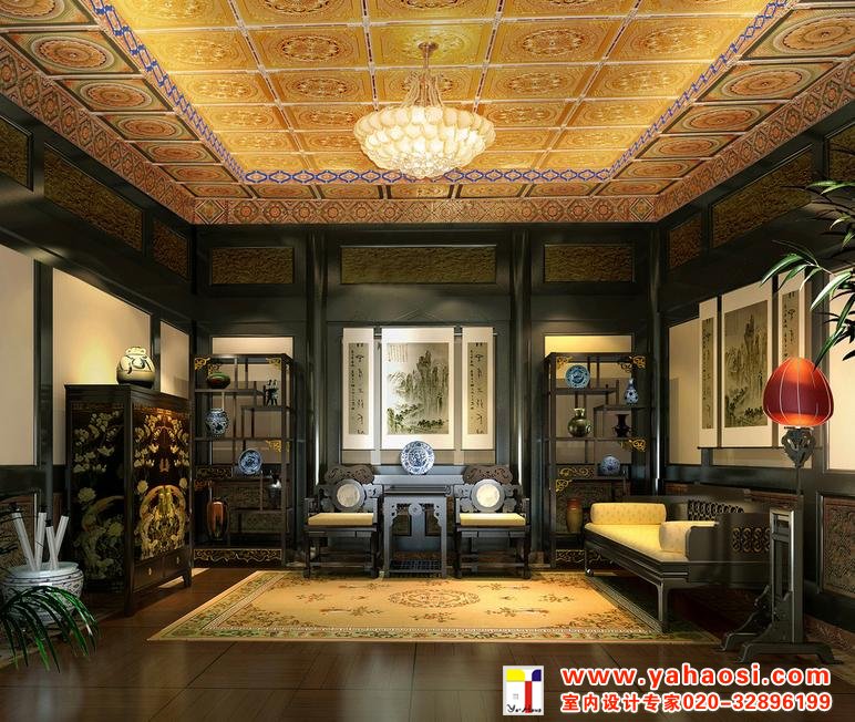 结合传统文化的理念,较好的吊顶规划是四边厚而中心薄的布置。这样的规划能够减轻天面构成的压抑感,视觉效果较为舒畅。