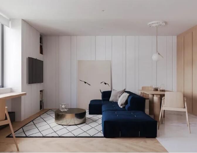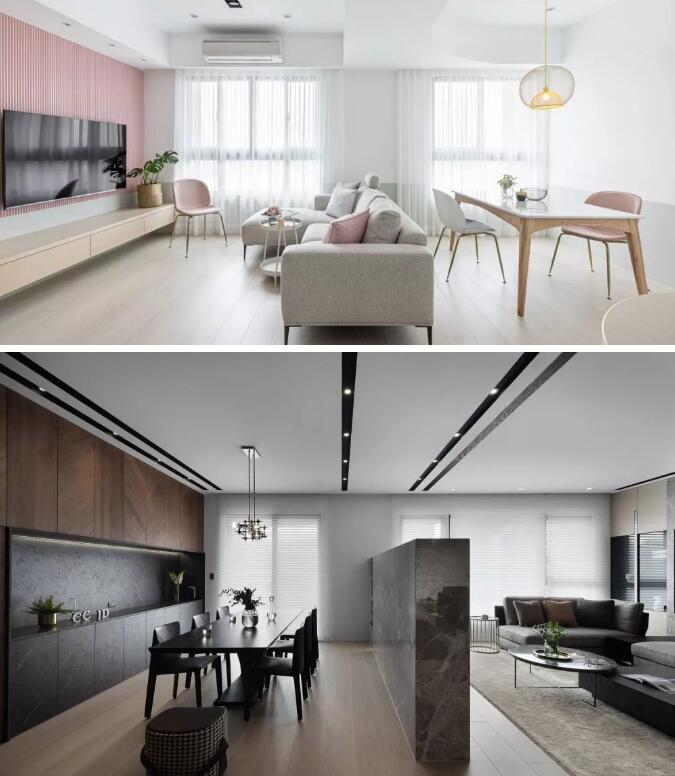 客厅和餐厅各占一面,沙发或电视背景墙放在中间作为隔断,既能增加功能,又不缺空间层次。