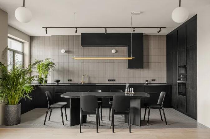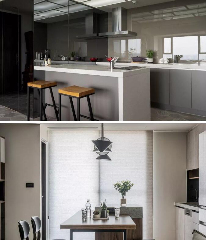 至于中岛,台面大,储物空间多,餐桌用起来其实很好。考虑到厨房水多油污大,建议选择石材作为台面,日常保养方便。