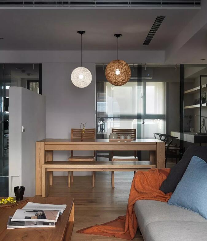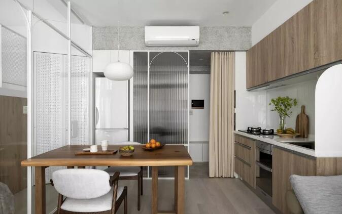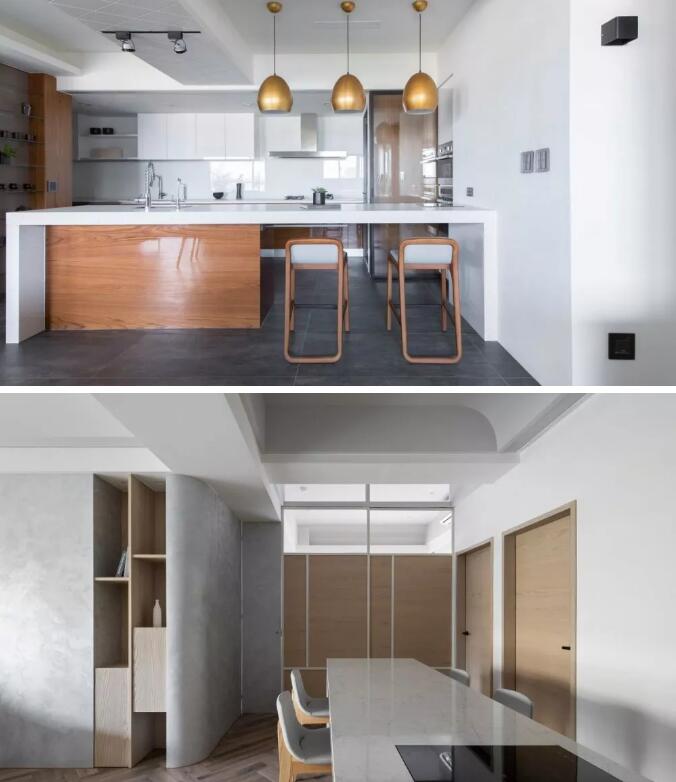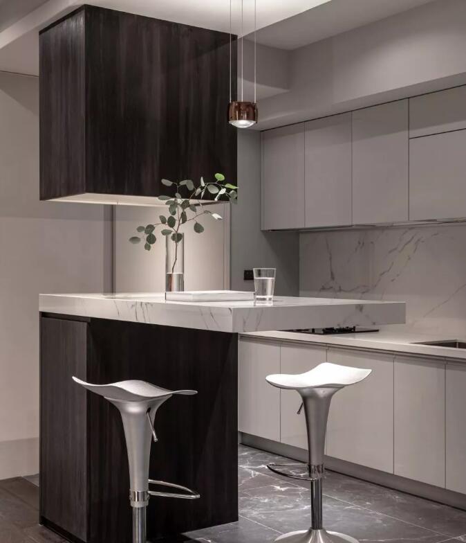 适合偶尔在家吃饭或人少的家庭设计,取消餐厅,用吧台或中岛代替餐桌功能,合理实用。
