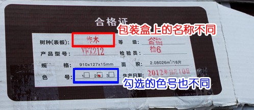 专家还指出了地板包装箱上的型号和色差标志的明显问题:虽然业内大家都知道扎木和橡木拉丝地板是一种东西,但2号和3号绝对不是一种颜色。2号必须安装2号颜色,否则区分颜色号没有意义。
